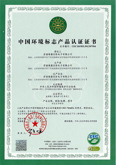 公司通過了CCC認證、節(jié)能認證、環(huán)境標(biāo)志產(chǎn)品認證、公安部安全與警用電子產(chǎn)品質(zhì)量檢測中心檢測報告(CNAS認證) 、ISO9001、14001、18001、CE、CB、FCC、ROHS、抗震防塵等多項資質(zhì)認證,并入選《政采節(jié)能產(chǎn)品清單》。